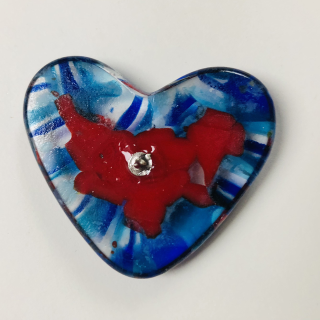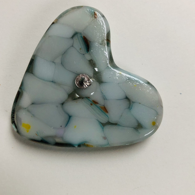 Fused glass hearts with pin to attach to clothes or bags .