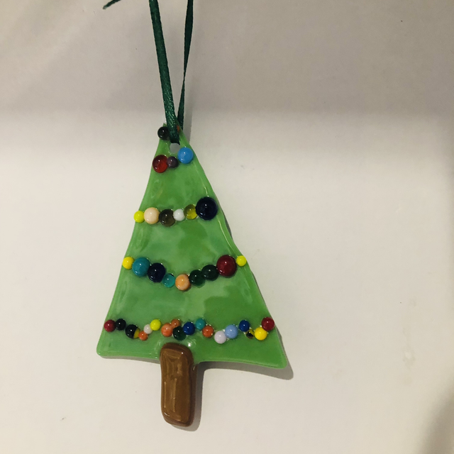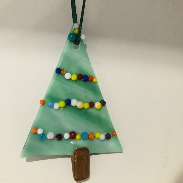 Fused Glass hanging Christmas Trees with multi coloured string balls.