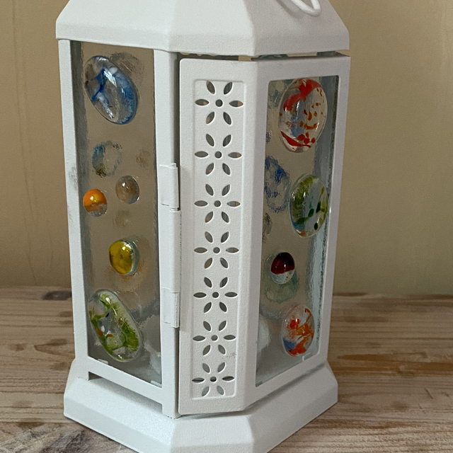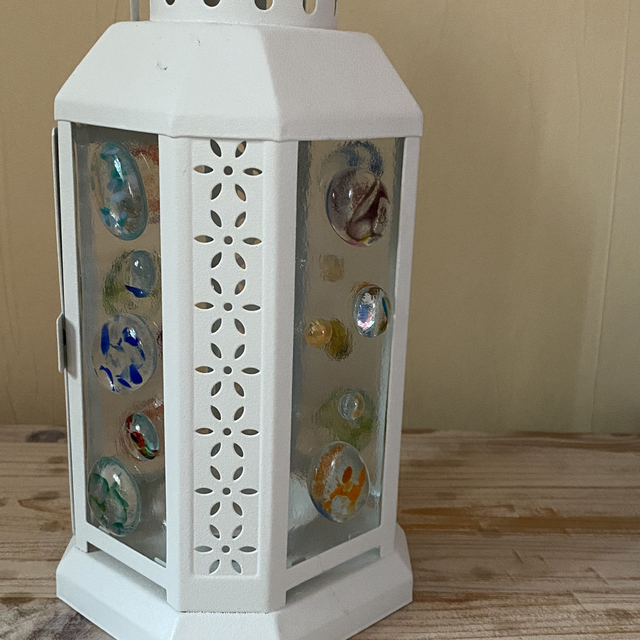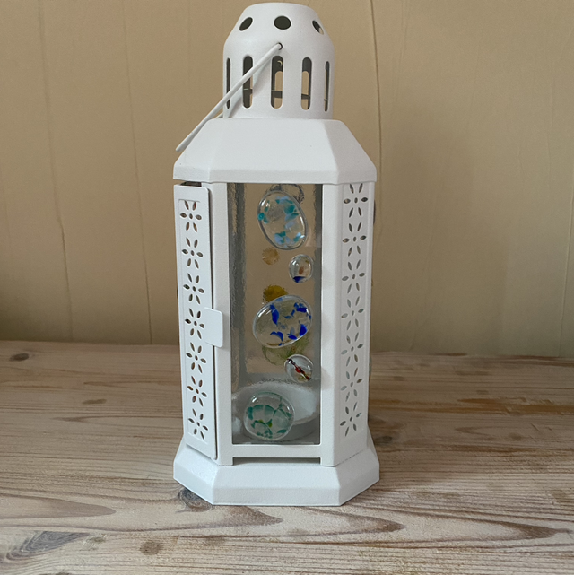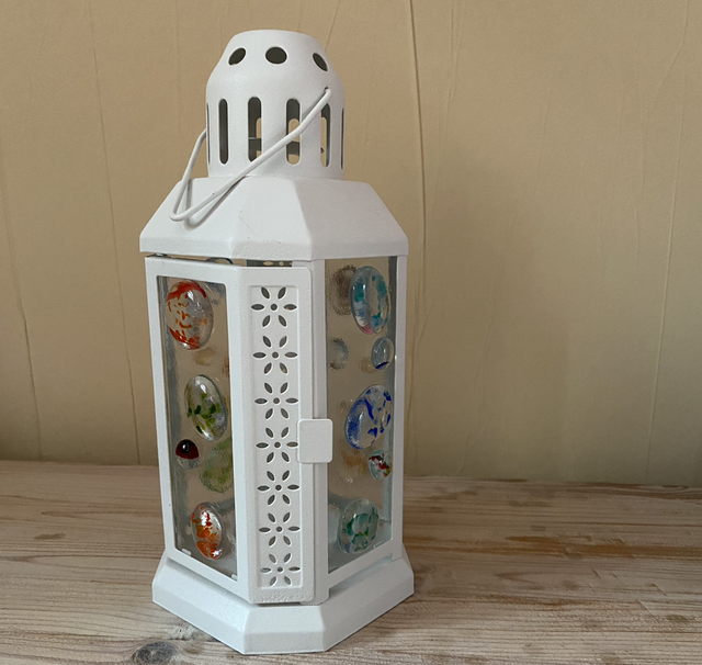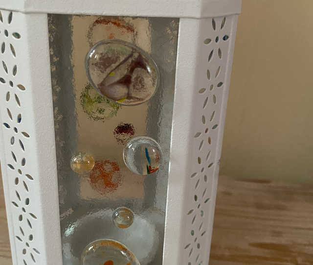 Lantern with speckled blobs fused to the glass panels.