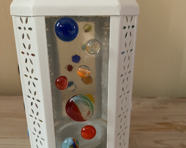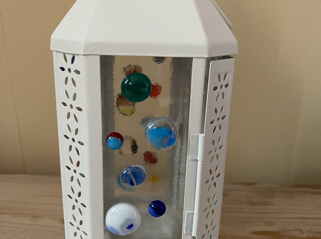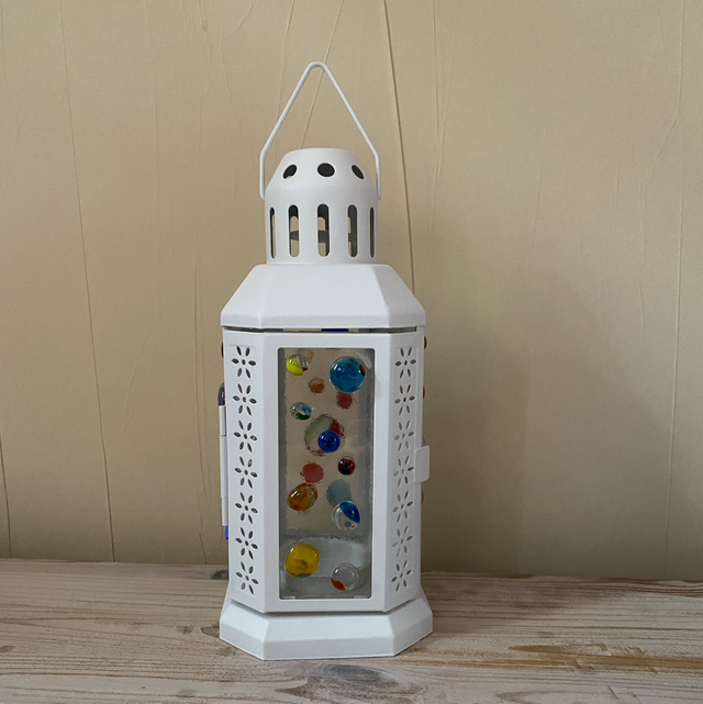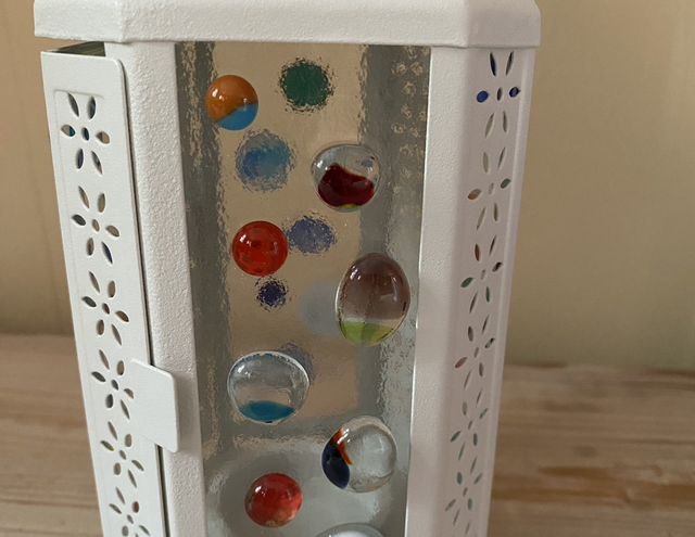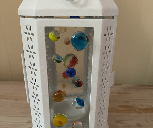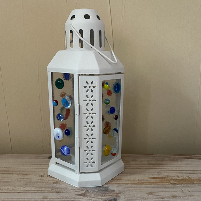 Lattern with colourful glass blobs fused onto the panels.